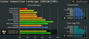 Quizás lo más interesante de todo, es que la arquitectura x86 AMD Zen5 mantendrá el liderado en términos de rendimiento respecto a cualquier otra arquitectura. Para ello, se usó como referencia el rendimiento que podrían alcanzar todas estas CPU o Arquitecturas bajo la prueba de rendimiento SPEC2K17INT Rate 1.